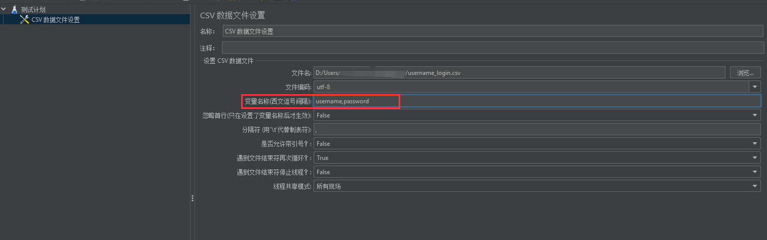 配置元件-CSV 数据文件设置(CSV Data Set Config)并配置 csv 文件,csv 文件保存用户的登陆信息(用户名、密码) 如图:![]()