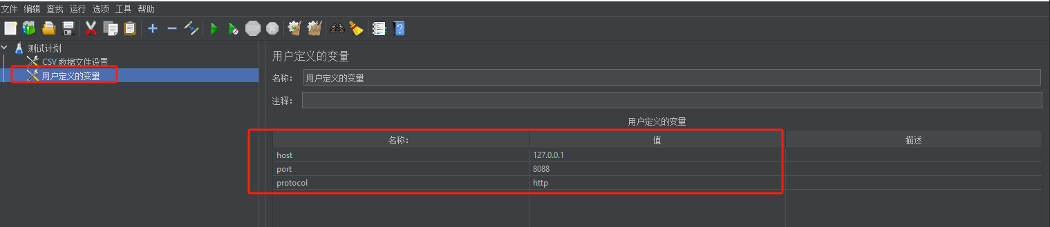 新建一个用户变量组件,保存全局请求的 host 主机地址、端口等,如图: