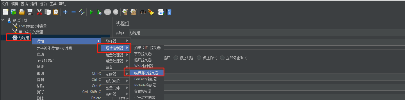 新建一个线程组,在添加一个临界控制器,临界控制器可以给一个锁表示,这里我们根据用户名称来锁边界,那么每个用户是并发的,在临界中调用接口是串行的,这样就达到目的了。